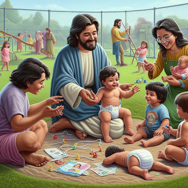 El pequeño Pedro era mi sobrino nieto, recién nacido. Costaba poco imaginarle en el parque con cualquier otro niño apenas hbiera crecido un poco. Y como el Niño Jesús, tendría sus compañeros de juego, sus padres vigilantes o a pacientes familiares departiendo con otros padres mientras cuidaban a sus pequeños.